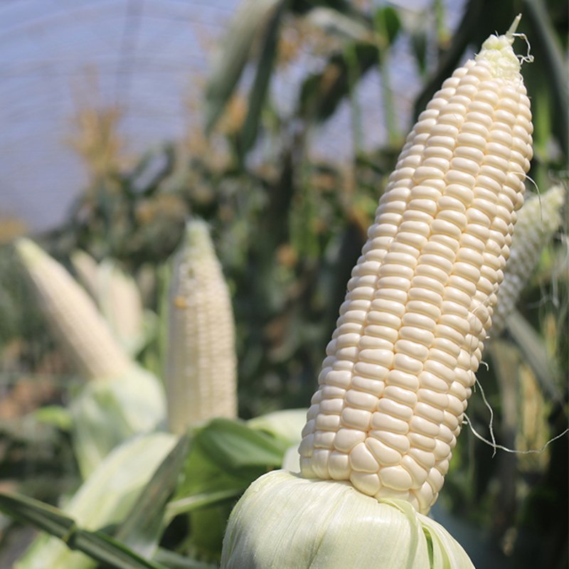 超甜型白色水果玉米雜交種,春播出苗至鮮穗采收平均75.3天。單穗重350-450g,苞葉鮮綠、緊實、旗葉多,穗長20㎝,穗粗4.6㎝,穗行數16.3行,行粒數36.1粒,禿尖少;籽粒雪白,顏色亮麗;鮮食皮薄多汁無渣,熟食清甜爽口,采收期糖度在20度左右,收獲期長,成品率高。株高約161㎝,穗位高約25㎝,穗位低而整齊,耐倒伏性強,栽培管理容易。